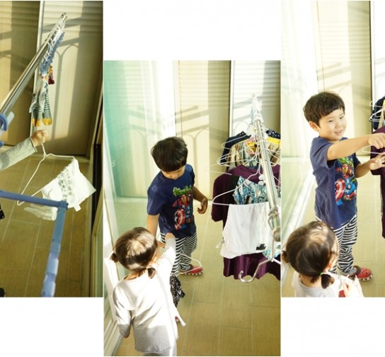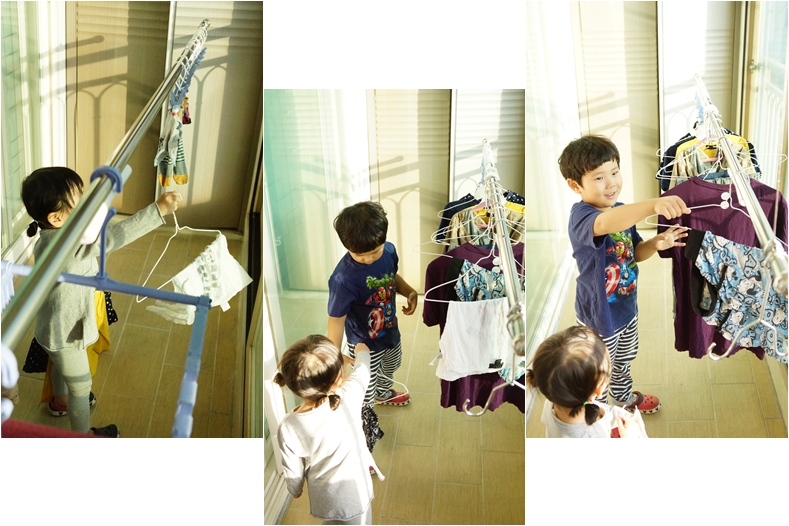 스스로 엄마 빨래를 도와준다는 생각에, 뿌듯한가봐요~