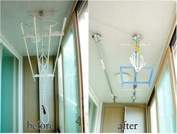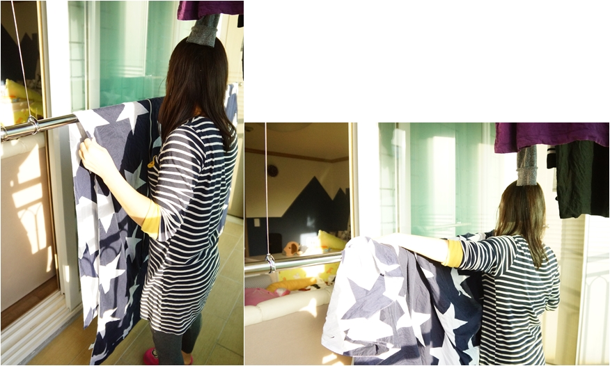 항상 빨래 할때는 옷걸이를 가져다 주는데, 기존의 천장빨래건조대는 높아서 스스로 할수가 없었는데요..