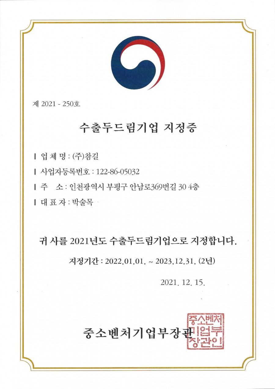 참길 수출두드림기업지정증 페이지 정보 작성자 최고관리자 작성일22-01-13 15:04 조회31,994회 댓글0건 관련링크 본문 저희 참길이 수출두드림기업에 지정되었습니다. 댓글목록 등록된 댓글이 없습니다. 이전글 다음글 목록